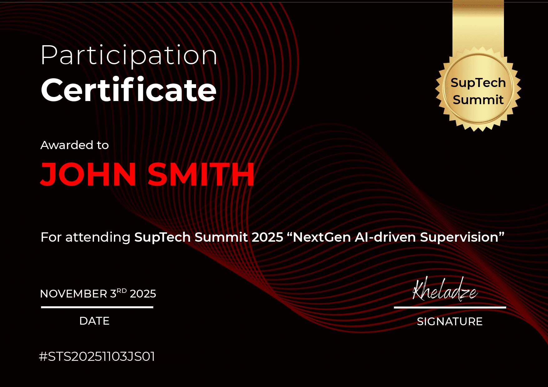 ყველა მონაწილემ მიიღო მონაწილეობის ოფიციალური ელექტრონული სერტიფიკატები. ეს სერტიფიკატები ადასტურებს თითოეული დამსწრის წვლილს გლობალურ SupTech დიალოგში და ხაზს უსვამს მათ ერთგულებას საზედამხედველო ტექნოლოგიების განვითარების მიმართ.