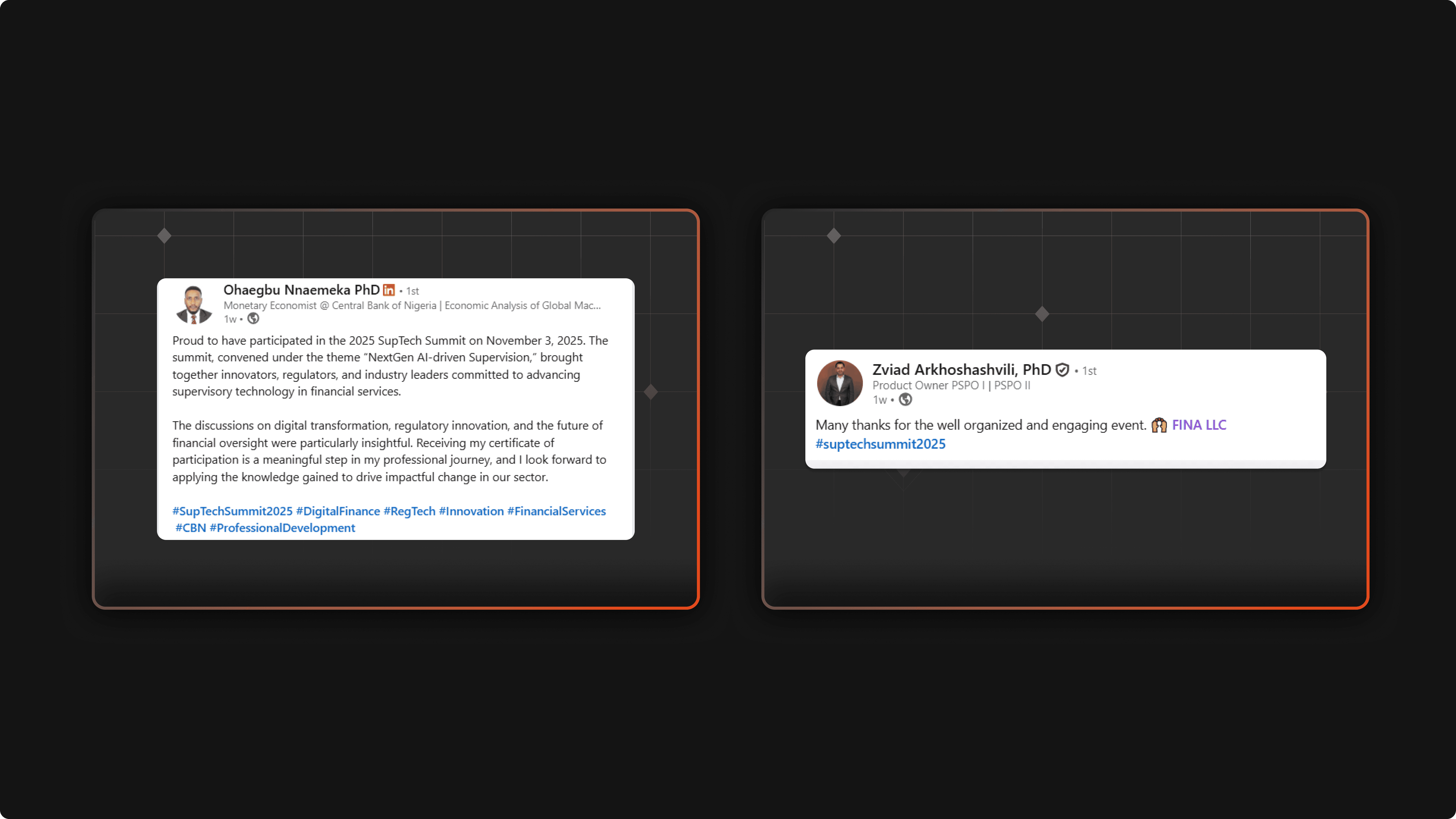 2025 წლის 3 ნოემბერს, მარეგულირებლები, ინოვატორები, ტექნოლოგები და ფინანსური სექტორის ლიდერები მთელი მსოფლიოდან ონლაინ შეიკრიბნენ SupTech Summit 2025-ში მონაწილეობის მისაღებად. ვირტუალური შეხვედრა, სწრაფად გადაიზარდა იდეების, სტრატეგიებისა და პრაქტიკული გადაწყვეტილებების გლობალურ გაცვლაში ფინანსური ზედამხედველობის მომავლისთვის.