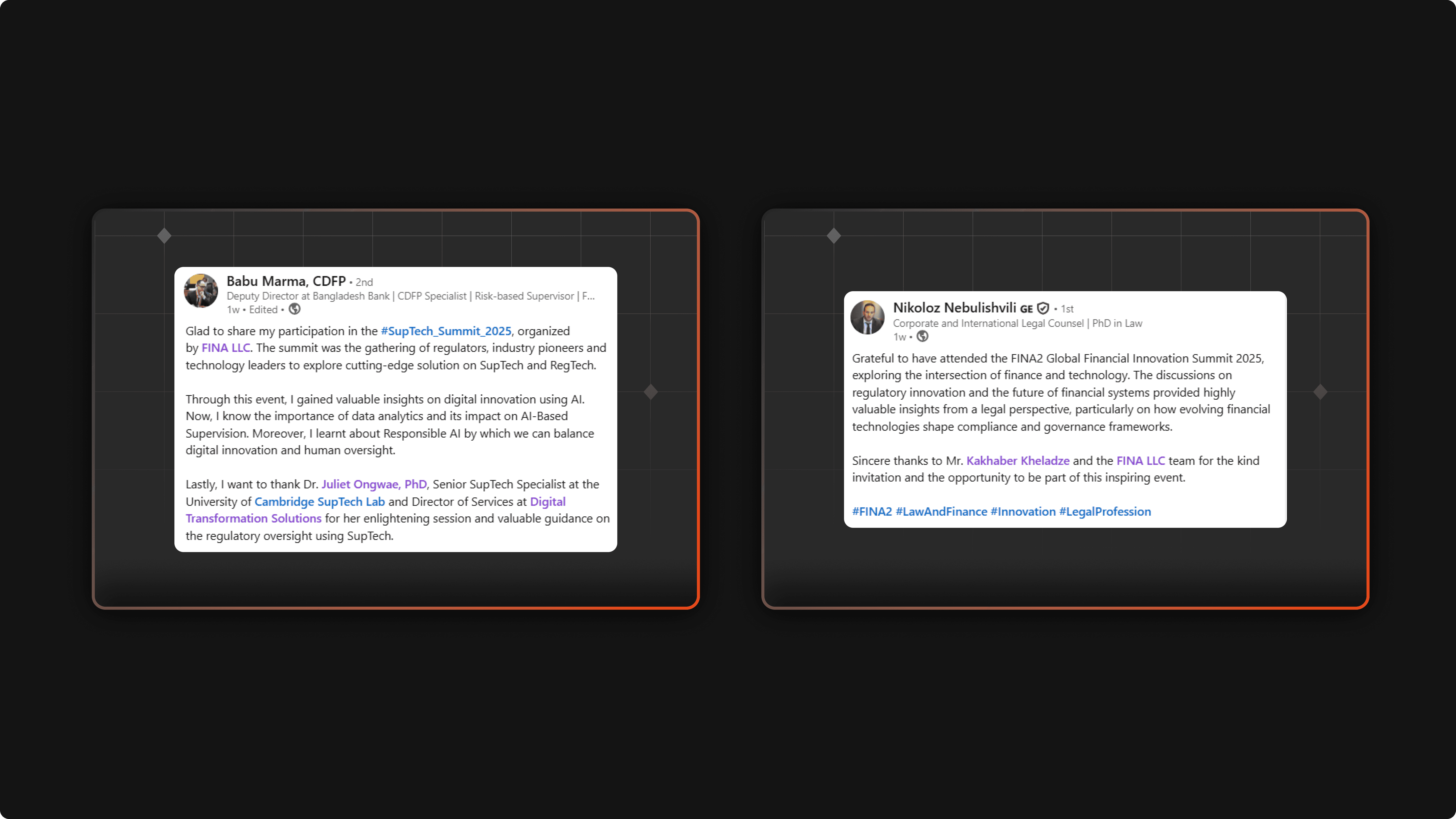 თუ გსურთ მიიღოთ SupTech Summit 2025-ის სრულ ჩანაწერზე წვდომა, გთხოვთ, გამოაგზავნოთ მოთხოვნა ელფოსტაზე: summit@fina2.net